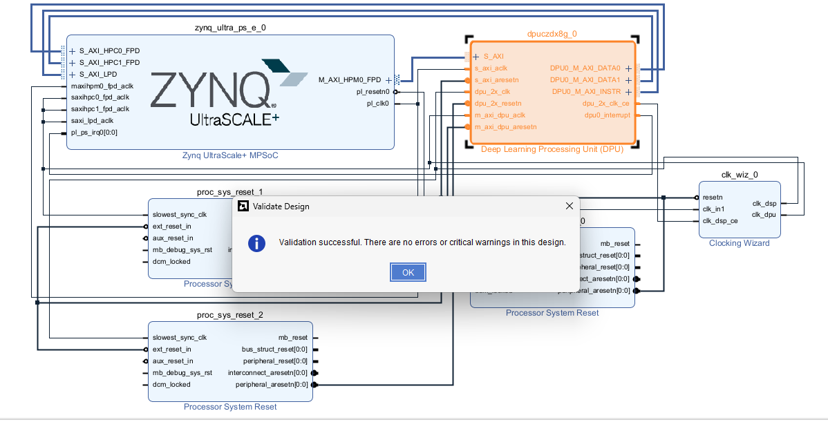 There were a few issues with data widths because the slave AXI on the DPU has a width of 32 bits but the master AXI on the MPSoC block was set to 128. Once these were changed it passed the validation, which then meant I could run synthesis and implementation to generate the bitstream.