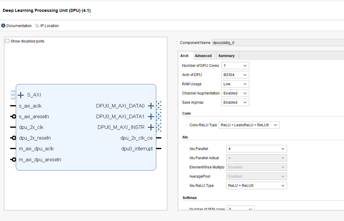 In the advanced settings I enabled clock gating, which allowed the clock for the DSP to be set to “Buffer with CE”. This is the clock that runs the DPU core. I also made sure to keep the DSP48 usage low.