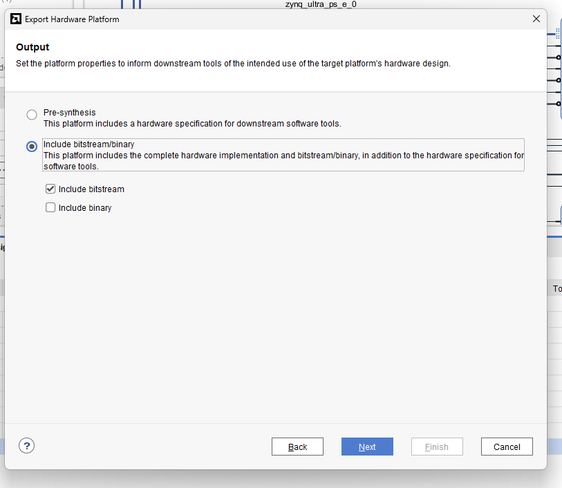 The last step of part 1 was to export the hardware platform, making sure to include the bitstream. This will create the Xilinx Support Archive needed by either Vitis or PetaLinux to create the platforms for the Ultra96-V2.