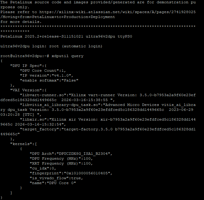 This should print out information about the DPU core, confirming that the accelerator is visible and configured correctly.
